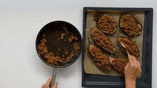 Мякоть готовых баклажанов вдавить вилкой внутрь, чтобы получились лодочки.