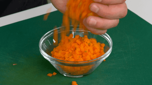 Лук и морковь нарезать мелким кубиком. Морковь можно и натереть на терке — это будет быстрее, но менее красиво.