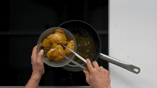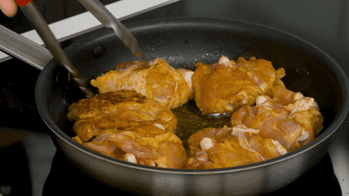 В сковороде разогреть масло и обжарить куриное мясо на сильном огне до золотистой корочки.