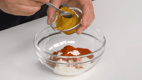 Смешать сметану с горчицей, водой, паприкой, мукой, солью и перцем.