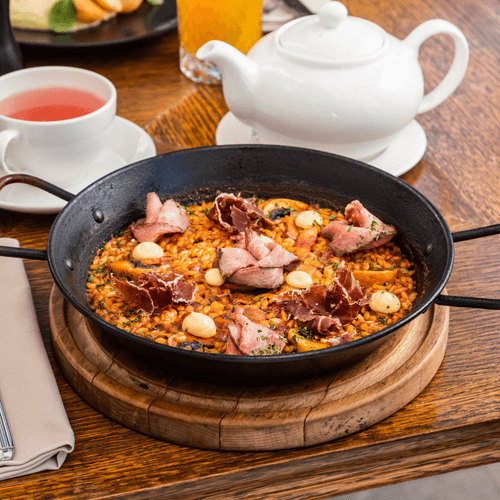 Паэлья, в своем самом изысканном варианте, требует особого ингредиента — хамона, который, правда, служит лишь для декорации и не меняет вкусовых характеристик самого блюда. Этот уникальный рецепт был предоставлен Алексеем Павловым, шеф-поваром ресторана Barceloneta.