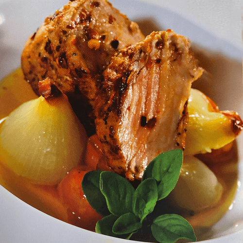 Маринованная свиная корейка с конфи из томатов и жемчужного лука — это изысканное блюдо латиноамериканской кухни, которое объединяет богатство вкусов и ароматов. Свинина, маринованная в смеси специй, орегано и винного уксуса, приобретает нежность и насыщенный, пикантный вкус. Ее дополнением служит томатное конфи с жемчужным луком — медленно запеченная композиция, раскрывающая естественную сладость ингредиентов. Легкая кислинка томатов, аромат свежих трав и мягкость лука создают гармоничное сочетание с мясом. Это блюдо идеально подходит как для торжественного ужина, так и для уютного семейного застолья. Подача его на конфи делает каждую порцию особенно сочной и аппетитной. Вдохновленное латиноамериканскими кулинарными традициями, оно очаровывает своей простотой и элегантностью.