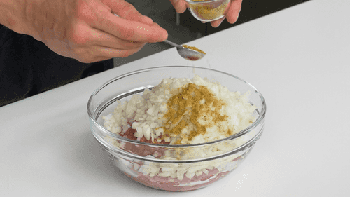 Смешать лук с бараниной, посолить, поперчить и добавить зиру.
