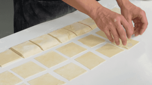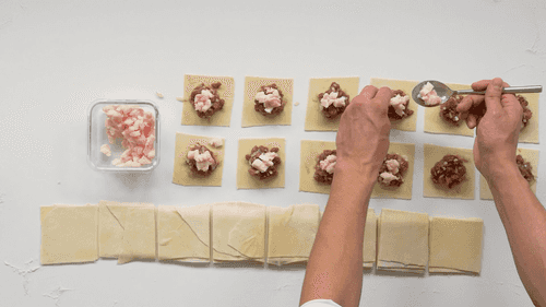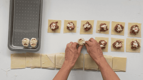 На квадраты выложить начинку из баранины с луком, сверху выложить немного курдюка.