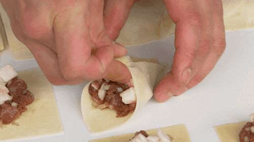 Слепить между собой два противоположных уголка теста, затем слепить другие два угла. Должен получиться пухлый «конверт» с небольшими дырочками на углах.