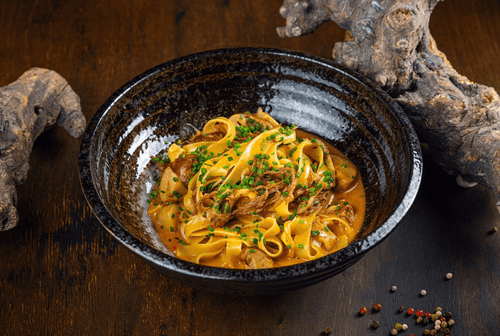 Феттучини с рагу из грибов, томатов и телячьих хвостов — это настоящая гастрономическая симфония вкусов, созданная для ценителей изысканной кухни. Авторский подход к этому блюду сочетает нежную текстуру пасты с насыщенным вкусом тушеных говяжьих хвостов, дополненных ароматными белыми грибами, сладкими томатами черри и бархатистыми сливками. Ключевой ингредиент — соус демигляс — придаёт блюду глубину и насыщенность, превращая его в настоящий ресторанный шедевр. Пармезан и сливочное масло завершают композицию, добавляя блюду мягкость и приятное послевкусие. Это блюдо идеально подходит для уютного ужина с бокалом красного вина, позволяя наслаждаться его многослойным вкусом и богатой текстурой.