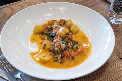 Добавить помидоры, бульон и каперсы, закинуть картофель. Довести до кипения, уменьшить огонь и тушить все вместе примерно 12 минут, до готовности картофеля. В конце посыпать рубленой петрушкой.