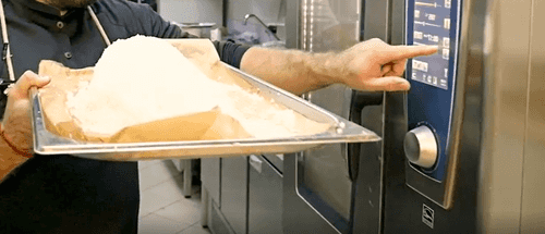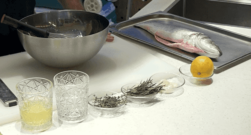 Не счищая соль, сбрызнуть рыбу кальвадосом или ромом, так, чтобы алкоголь ни в коем случае не попал за пределы противня. Аккуратно поджечь алкоголь, затем сбить огонь при помощи полотенца.