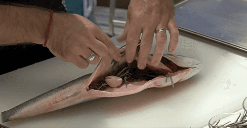 Внутрь рыбы засунуть веточки тимьяна и розмарина. 2 зубчика чеснока очистить, раздавить ножом и тоже выложить внутрь рыбы.