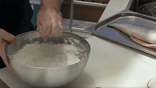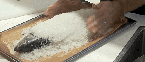 Положить на подложку рыбу и укрыть ее солью так, чтобы хвост и голова торчали наружу.