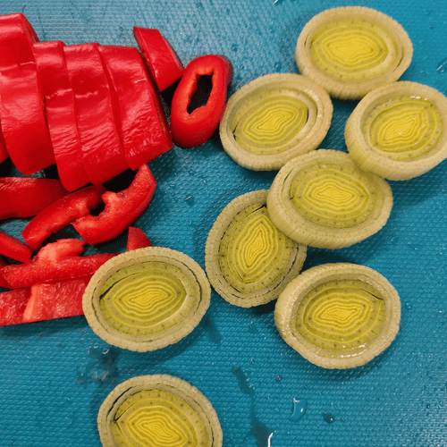 Порей тоже нарезать кольцами.