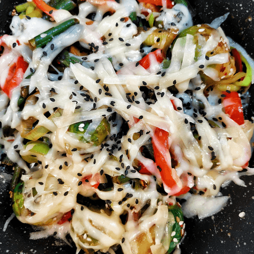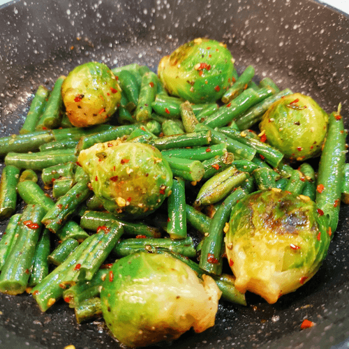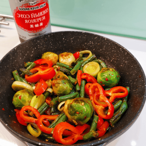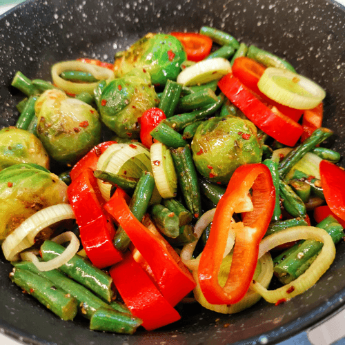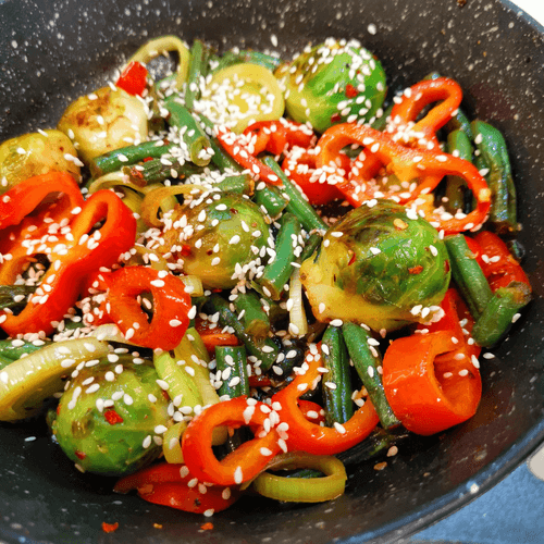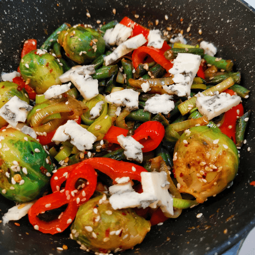 Овощное рагу с сыром дорблю и пармезаном — изысканное блюдо французской кухни, сочетающее свежесть овощей и нежную кремовость голубого сыра. Этот рецепт уходит корнями в традицию французских рагу, где гармония вкусов играет ключевую роль. Брюссельская капуста, фасоль и сладкий перец рамиро наполняют блюдо насыщенным ароматом, а сливочное масло придаёт ему мягкость. Острота перца чили и глубина соевого соуса оттеняют богатый вкус дорблю, который плавится, создавая бархатистую текстуру. Завершающий штрих — пармезан, добавляющий легкую ореховую ноту. Это рагу отлично подходит как самостоятельное блюдо, так и в качестве гарнира к мясу или рыбе. Его подают горячим, давая сыру полностью раскрыть свой вкус, а кунжут добавляет приятную хрусткость, завершая гастрономическое удовольствие.