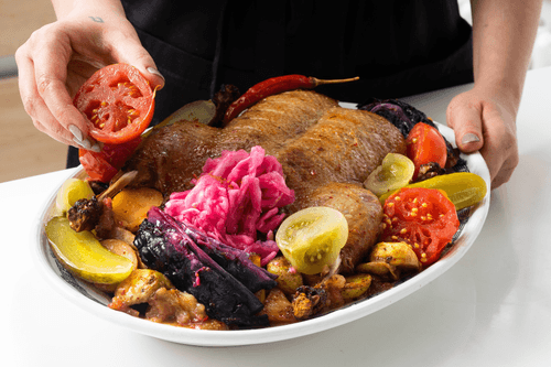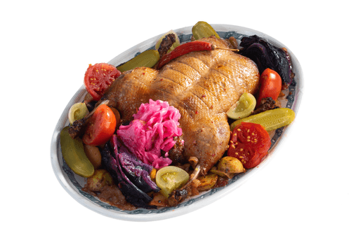 Дать утке отдохнуть еще 10 минут, выложить на большое блюдо вместе с гарниром. К утке подать домашние соленья — красные и зеленые помидоры, бочковые огурчики и гурийскую капусту.