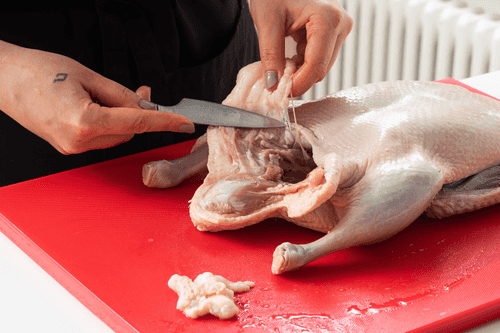 За 2 часа до готовки достать утку из маринада, обсушить и дать ей нагреться до комнатной температуры. Срезать лишний жир на брюшке и в районе шеи.