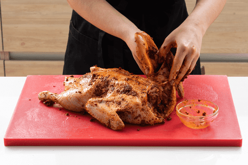 Утку изнутри и снаружи натереть аджикой, выложить на решетку, снизу подставить противень.