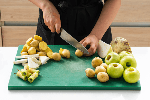 Пока утка запекается, подготовить овощи для гарнира. Картофель тщательно вымыть щеткой, сельдерей не чистить. Нарезать и то и другое дольками в 1,5 см. «Антоновку» разрезать пополам, удалить сердцевину и нарезать крупными дольками.