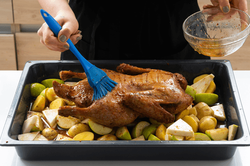 Когда гарнир почти готов (яблоки должны стать мягкими и развалиться, а овощи — полностью пропечься), снова выложить утку на овощи грудкой вверх и запекать еще 10–15 минут.