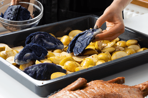 Вынуть утку из духовки, переложить на доску или подогретую тарелку, накрыть фольгой и дать отдохнуть. На овощи выложить утку и запекать еще 30 минут. Увеличить температуру в духовке до 190 градусов. Добавить к гарниру красную капусту и отправить овощи в духовку еще на 30 минут, периодически помешивая.