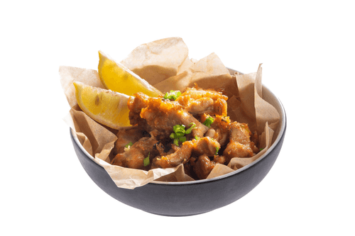 Выложить курицу карааге на тарелку, украсить колечками зеленого лука и подавать с долькой лимона.