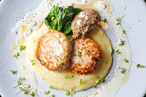 Для подачи: на тарелку выложить котлеты с картофельным пюре, шпинатом, добавить грибную икру и подавать с соусом сюпрем.