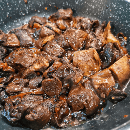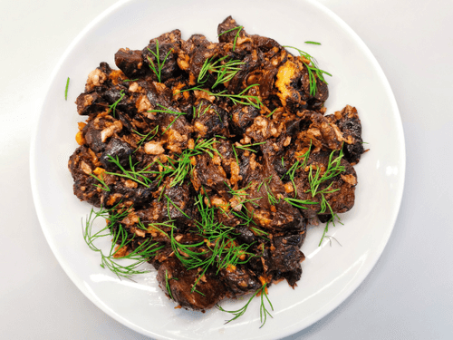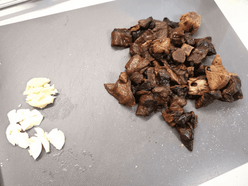 Как только чеснок и имбирь обжарятся с обеих сторон, удалить их и выложить грибы.