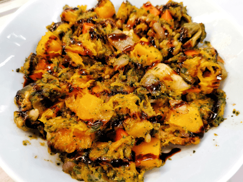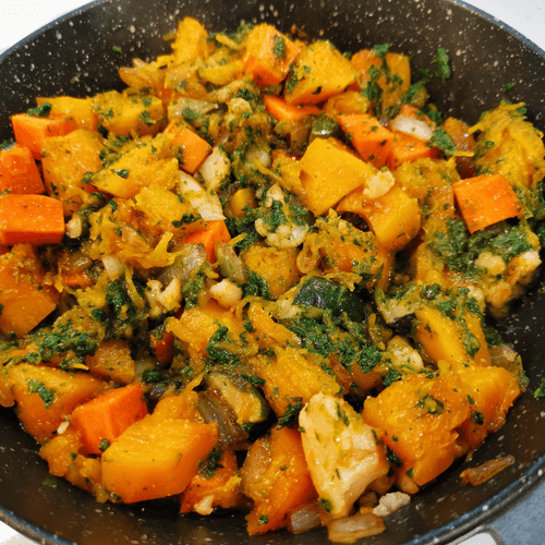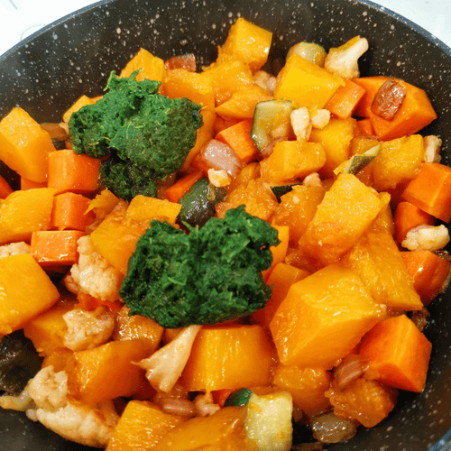 Сладкое овощное рагу с тыквой – это яркое блюдо американской кухни, которое сочетает нежную сладость тыквы с насыщенными вкусами цветной капусты, шпината и молодого кабачка. Оно воплощает тепло осеннего урожая и уют домашних вечеров. Лук, карамелизованный в бальзамическом соусе, придаёт глубину вкуса, а морская соль тонко подчеркивает природную сладость овощей. Это блюдо универсально – его можно подавать как самостоятельное лёгкое блюдо или в качестве гарнира к мясу или рыбе. Оно полезно, питательно и визуально привлекательно благодаря ярким цветам ингредиентов. Рагу отлично подходит для вегетарианского меню и является прекрасным способом насладиться богатством сезонных продуктов.
