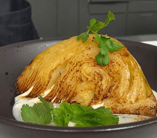 Капуста с соусом из голубого сыра — это блюдо, сочетающее простоту и изысканность. Запечённая до нежности капуста обжаривается до золотистой корочки, раскрывая свой сладковатый вкус. Соус из голубого сыра, томлённый в сливках с ароматными семенами тмина, придаёт блюду насыщенный, кремовый оттенок с пикантными, чуть острыми нотами. Это сочетание делает его идеальным гарниром к мясным блюдам или самостоятельным лёгким ужином. Голубой сыр, традиционно используемый в европейской кухне, добавляет благородности и глубины вкусу, а свежая кинза — свежести. Вдохновлённое кулинарными традициями Западной Европы, это блюдо превосходно подойдет для уютного семейного ужина или праздничного стола.