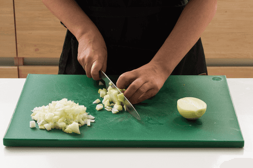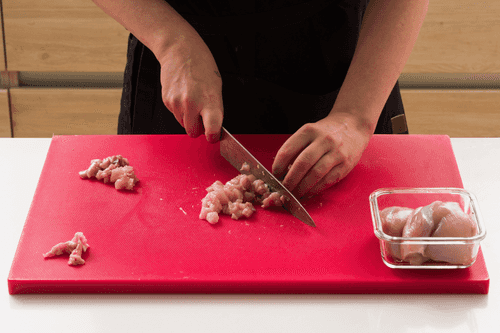 Курицу нарезать кусочками в 1 см (если филе на коже, ее можно снять, но с кожей будет вкуснее).