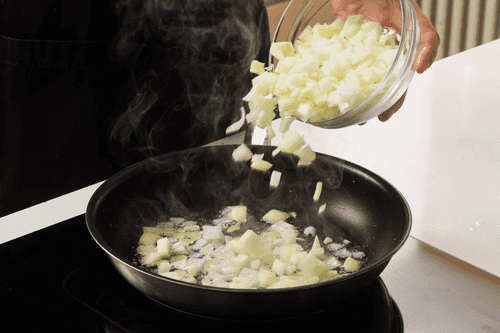 Разогреть в глубокой сковороде растительное масло, выложить лук и, помешивая, жарить до едва золотистого цвета.