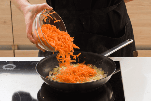 Добавить в сковороду морковь и, слегка прибавив огонь, довести морковь до полуготовности. Посолить и перемешать.