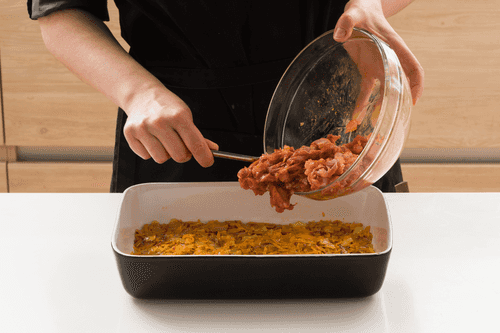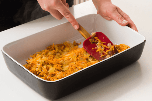 В форму для запекания выложить получившуюся зажарку и распределить ее по дну.