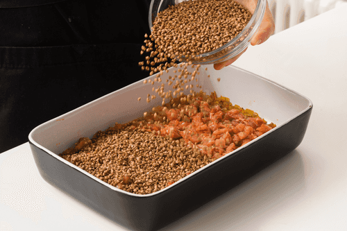Накрыть форму фольгой и убрать в разогретую до 180 градусов духовку примерно на 40 минут (гречневая крупа должна быть полностью готова).