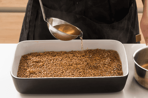Разогреть воду или бульон почти до кипения и пролить гречневую крупу, наливая воду или бульон в форму через половник (так жидкость оставляет слой крупы ровным и распределяется более равномерно).
