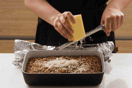 Достать форму, аккуратно снять фольгу, посыпать гречневую крупу тертым сыром. Снова укрыть фольгой (фольга не должна соприкасаться с сыром!). Уменьшить температуру духовки до 160 градусов и вернуть гречневую крупу в духовку на 10 минут.