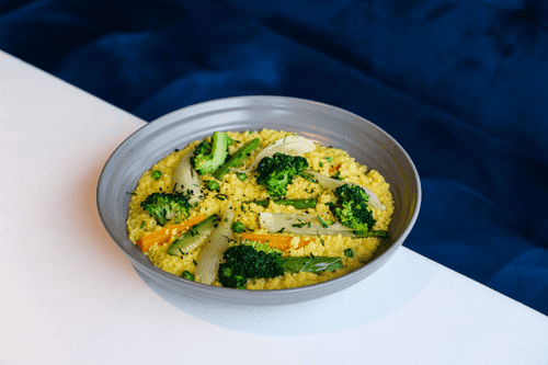 Для приготовления кускуса в этом рецепте используется овощной бульон с добавлением шафрана, что придаёт ему яркий вкус и аромат. Приготовление занимает минимум времени, так как кускус не нуждается в длительном настаивании. Этот рецепт был вдохновлён кухней ресторана «Магадан».