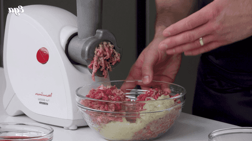 Мясо, жир, лук и чеснок пропустить через мясорубку.