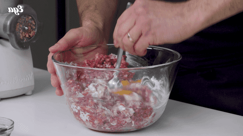 Добавить к фаршу яйцо, 90 мл сливок, соль и перец, перемешать и отбить. Готовый фарш убрать в холодильник на 1–2 часа.