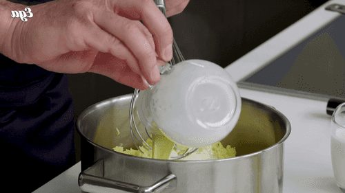 Добавить к пюре 150 мл горячих сливок и перемешать венчиком.