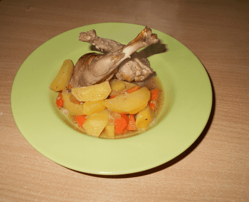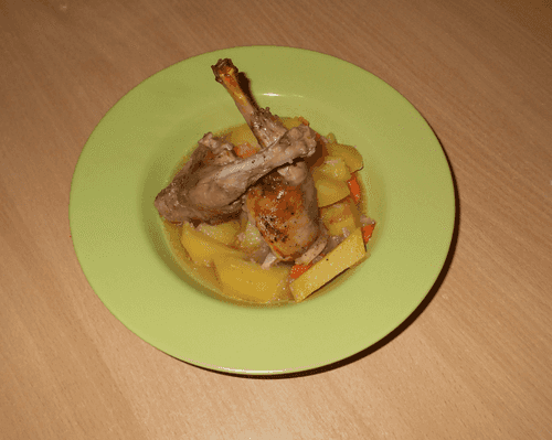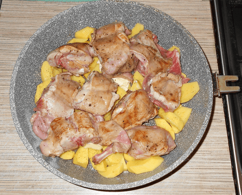 Отправить кролика с картошкой в заранее разогретую до 200 градусов духовку на 50–60 минут.