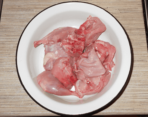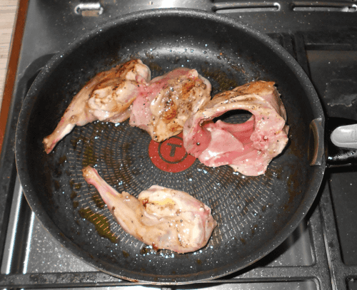 Взять замаринованные куски кролика и обжарить на сильном огне с двух сторон, чтобы запечатать мясо.