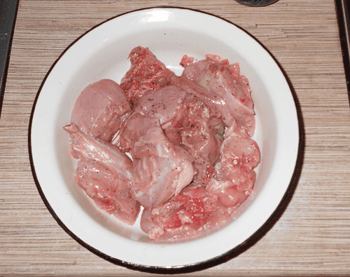 Посыпать кролика черным перцем, солью. Добавить уксус и немного растительного масла. Оставить мариноваться 40–60 минут.