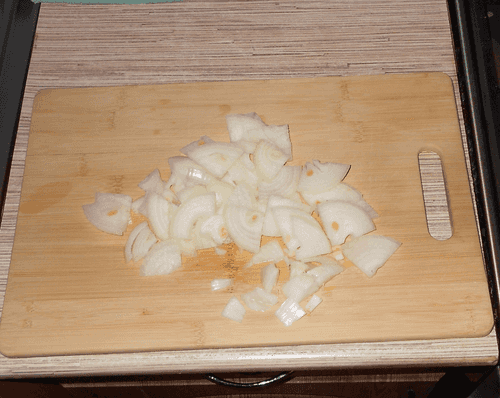 Пока кролик маринуется, взять репчатый лук, почистить и нарезать на четверть кольца.