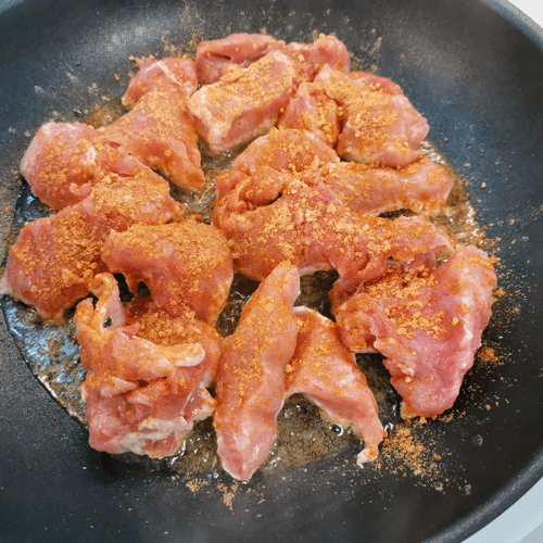 Приправить свинину карри и специей для мяса.