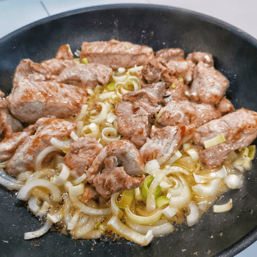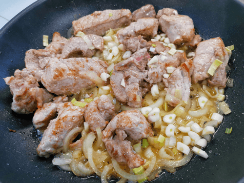 Перемешать мясо через 3-4 минуты и добавить лук.