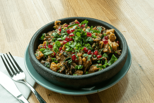 При подаче на стол добавить свежую зелень и зерна граната.