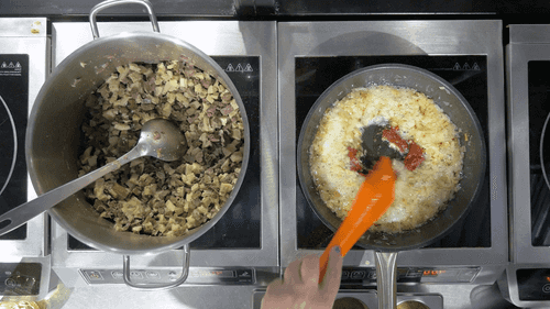 Обжарить на сковороде лук, добавить томатную пасту и перемешать.