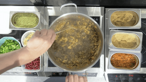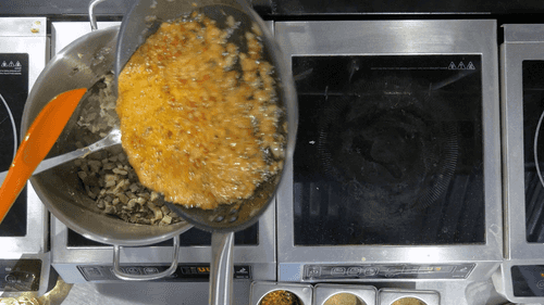 Продолжая обжаривать, добавить сухие приправы, чеснок, соль, перец и уксус.