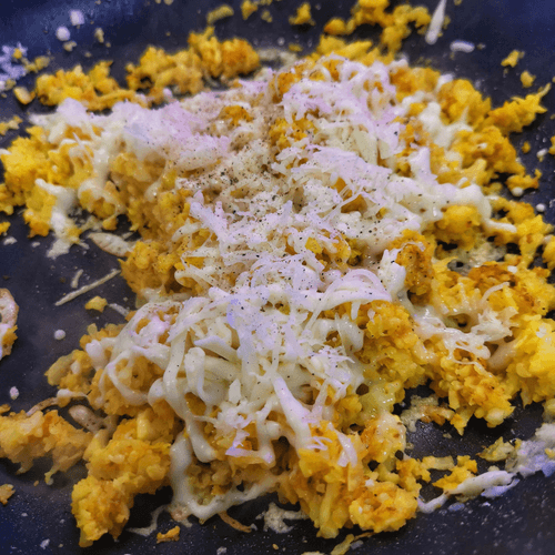 Добавить тертый сыр и черный перец. Перемешать и снять с огня.