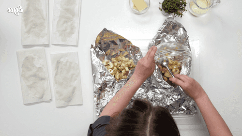 Добавить грибы, белое вино, тимьян и размягченное сливочное масло.