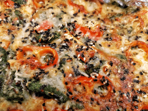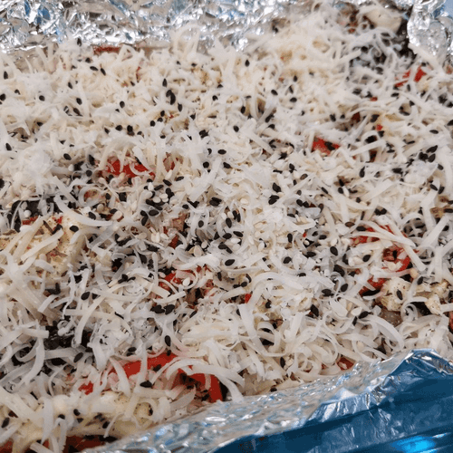 Сверху выложить нарезанный кольцами рамиро, присыпать пармезаном и кунжутом.